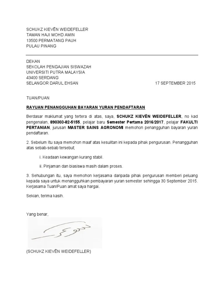 Contoh surat rasmi rayuan penangguhan bayaran yuran semester surat.